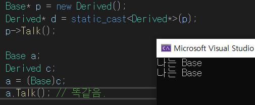 부모 클래스의 함수를 자식에서 '재정의'했으므로 부모 타입에 자식 객체를 생성하여 Talk를 호출하면 Derived의 함수가