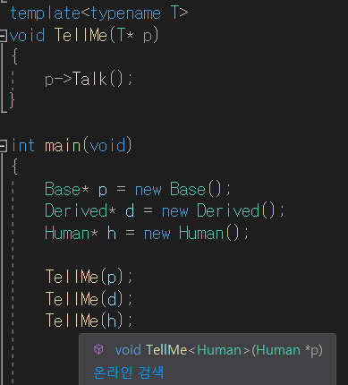 하지만 위의 함수 템플릿에서 다른 사용자가 Talk멤버 함수를 가진 Base나 Derived 객체를 가리키는 포인터 변수가 아닌
