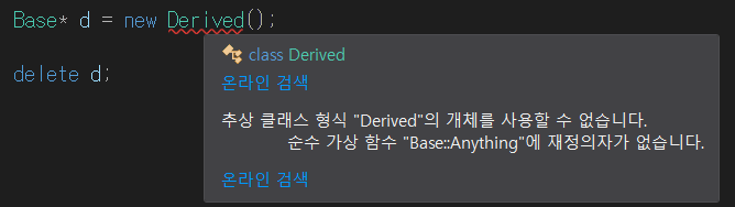 위와 같이 virtual void Anything() = 0;. 가상함수의 끝에 0을 대입하는 키워드를 넣어주면 해당 함수는 순수 가상함수가 되며 해당 클래스는 추상 클래스가 되어 객체 생성이 불가능해진다.