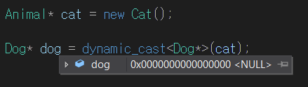 cat포인터 변수가 가르키고 있는것은 Cat객체. dynamic_cast를 통해 Dog*로 형변환할 시