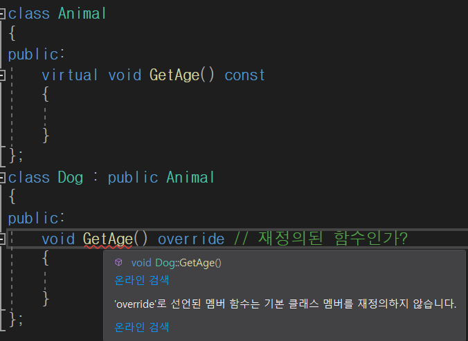 자식 클래스인 Dog에서 재정의할 멤버함수 GetAge에 const를 붙이지 않았기에 오버라이딩 되지 않는다.