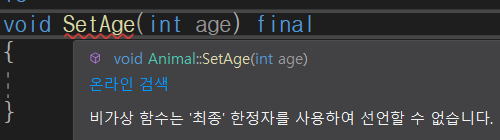 당연하지만 가상 함수가 아니면 쓸 수 없다.(비 가상함수는 final키워드 자체가 적용이 안되서 컴파일 에러를 뱉는다.)