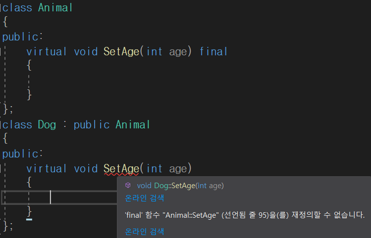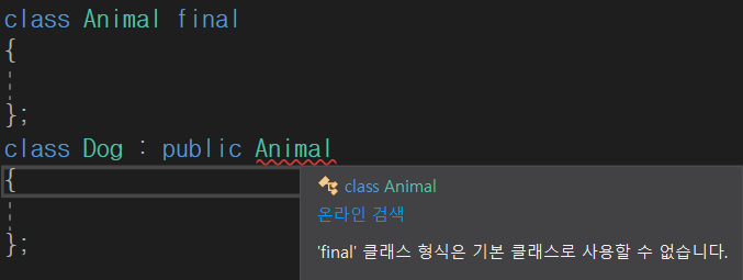 final키워드는 클래스 상속뿐만 아니라, 가상 함수의 오버라이딩을 못하도록 할 때에도 사용된다.