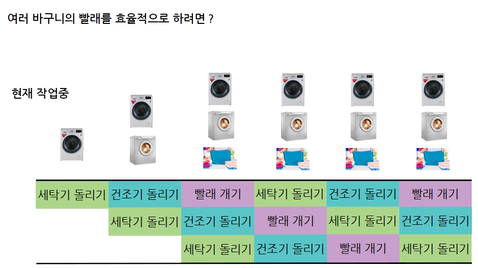 기존의 방식에서는 하나의 명령어(하나의 빨래 바구니)를 모두 처리하고 나서 다음 명령어(다음 빨래 바구니)를 처리하는 방식이었다고 했지만 위와 같은 빨래를 돌리는 방식을 생각해보면 이는 비효율적.