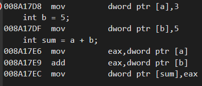 먼저 a가 있는 메모리 번지의 값을 레지스터 eax에 저장하고, b가 있는 메모리 번지의 값을 레지스터 eax에 있는 값과 덧셈(add)연산을 한다. 그 후 연산된 결과값이 저장된 eax의 값을 sum의 메모리 번지에 저장한다.
