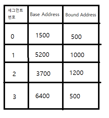 세그멘테이션 테이블은 세그먼트번호,BaseAddress,Bound Address(세그먼트의 크기)정보를 나누어 저장하고 있다.