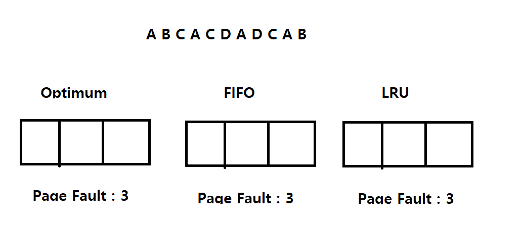 이런식으로 처리를 해보면 Optimum,FIFO,LRU는 각각 페이지 부재가 5,6,5가 발생하게 된다.