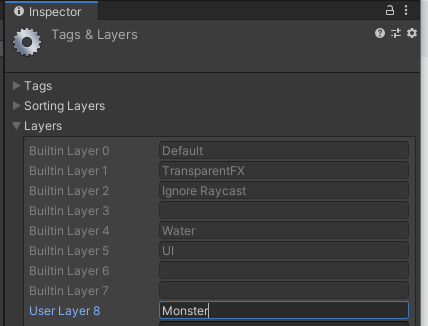 즉 Raycast의 인자로. 8번째 비트만 켜진 int형 값을 건네면 우리는 Monster라고 지정한 Layer를 대상으로만 Ray연산을 진행한다는 뜻.