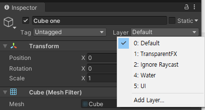layerMask를 사용하기 위해. 게임오브젝트의 Layer에 우리가 원하는 Layer값을 넣어주면 되는데.