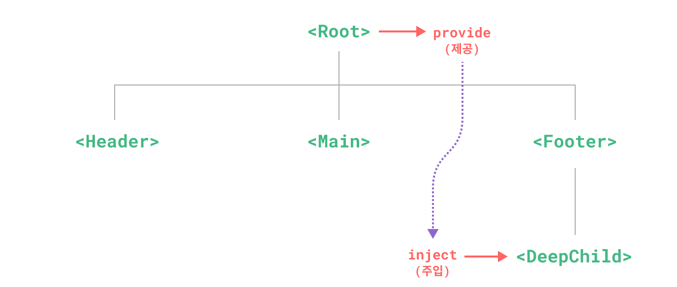 provide, inject - 부모 컴포넌트에서 자식에게 데이터를 전달할 떄 사용 (props와 같이 직계자식에게만 전달 할 수 있는 속성의 경우 부모노드와 자식노드간의 레벨이 2이상 차이나는경우 자식을 여러번 거쳐서 데이터가 전달되어야하지만 provide, inject를 통해 바로 전달가능)